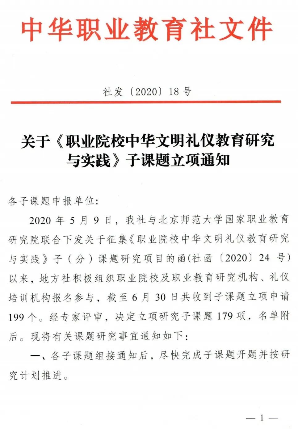 近日,根据中华职业教育社文件 社发{2020}18号文件关于《职业院校中华文明礼仪教育研究与实践》子课程立项通知,修齐礼仪独立申报《中华行为礼仪在礼仪培训中的探究》课题获得国家职业教育研究院批准立项,是国内唯一一家礼仪培训机构独立申报的礼仪研究课题。
